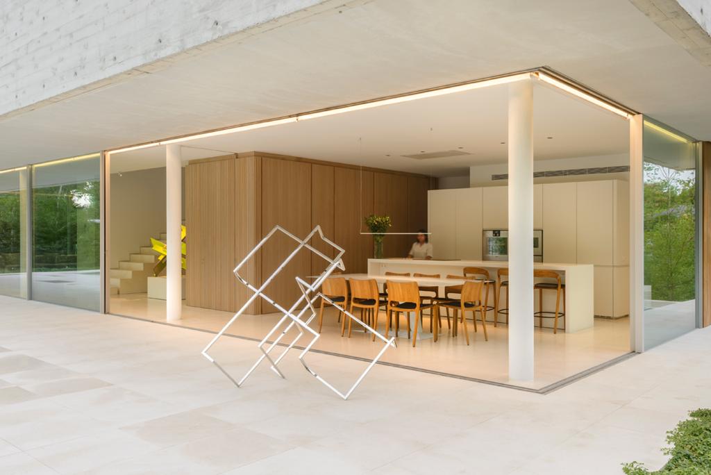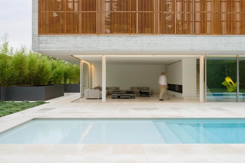 Located in Mirasierra, north of downtown Madrid, the house is a 760 sqm three-story home composed of a solid 22.8 meter-long concrete block standing above a permeable prism of glass. The living and dining areas occupy the ground floor, which is wood-clad towards the street, communicating with the plinth that defines the entrance by a central pivot door while fully opening to the opposite garden and the 20-meter-long pool through large floor-to-ceiling ah!38 birail panoramah! minimalist glass doors.