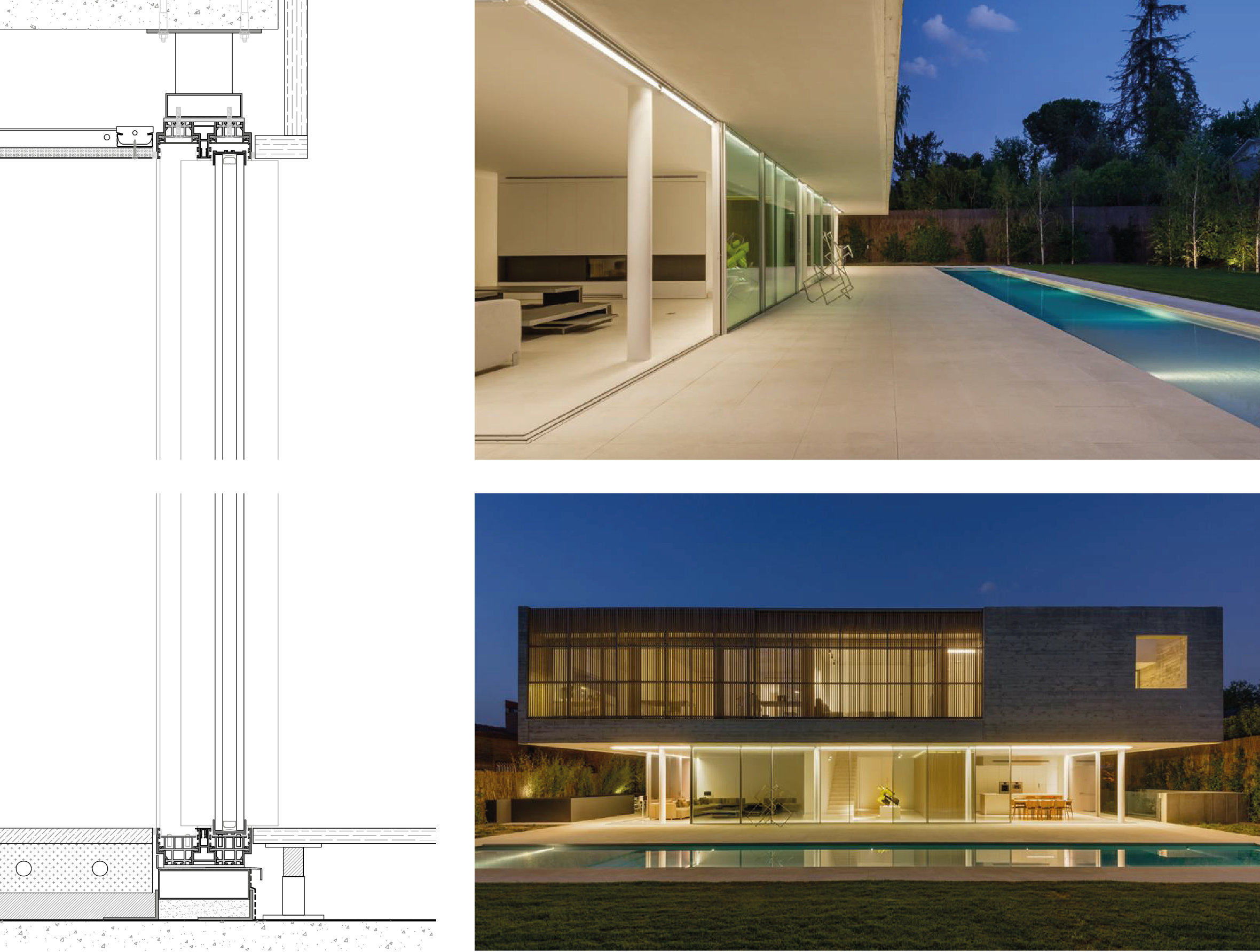Modern two-story house with an illuminated pool at dusk, featuring panoramah!'s minimalist sliding glass windows.